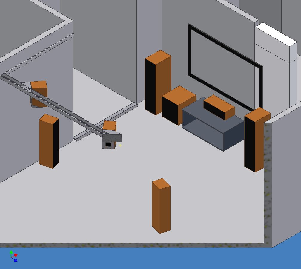 Nå er jeg lei av å klø meg selv i hodet, og vil gjerne ha litt synspunkter fra dere. Saken er at jeg holder på å innrede ny hjemmekino etter å ha flyttet. Problemet er oppsettet av de bakre kanalene da rommet setter sine begrensninger. Det jeg har kommet frem til på egen hånd er det dere ser i de vedlagte bildene. Jeg har vinklet alle bakhøytalerne inn mot lytteposisjon og de står like langt fra lytteposisjon (se skisse ovenfra). For å i det hele tatt greie dette må jeg lage en bjelke som går på tvers av rommet som jeg henger bakhøytalerne på. Denne må jeg uansett ha, for prosjektoren skal også henge i denne.